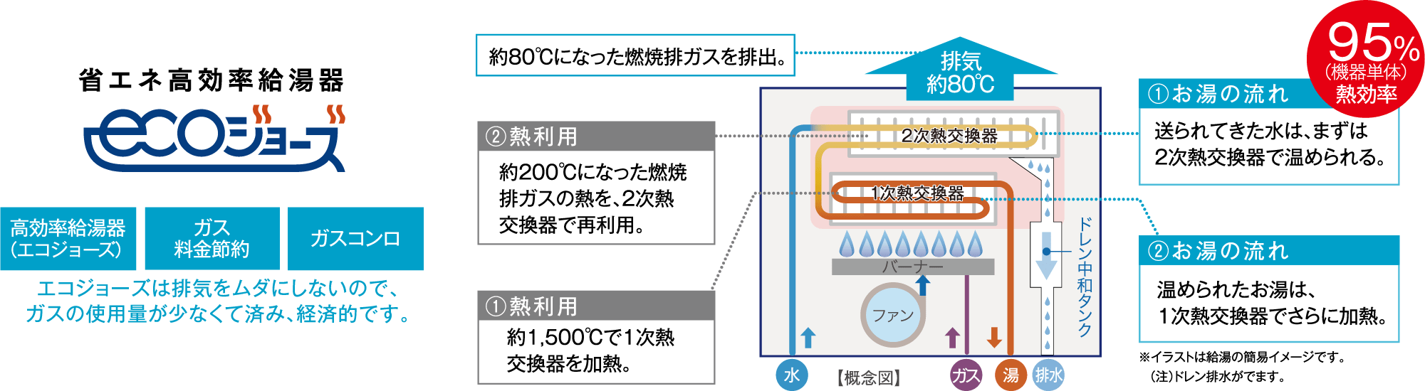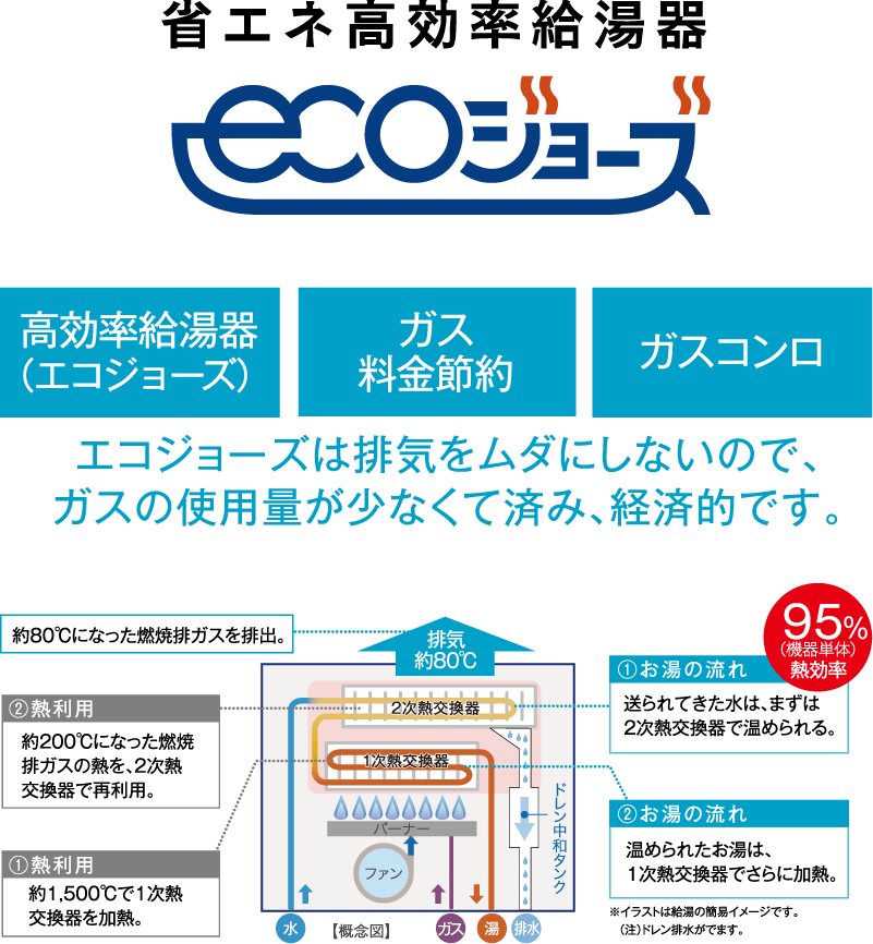 エコジョーズは従来の給湯器では外部に排出していた排気熱を回収して再利用することで給湯効率が向上した省エネ設計の給湯システムです。