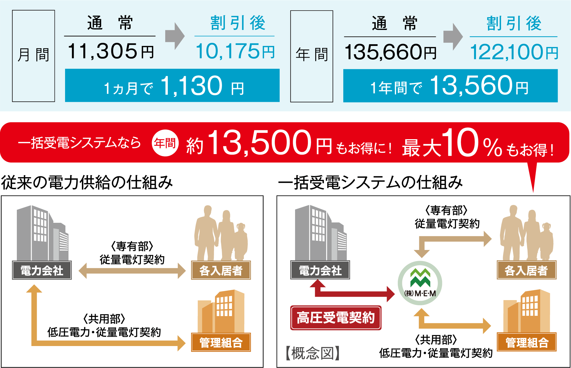 一括受電システムで電気料金を最大10%軽減。