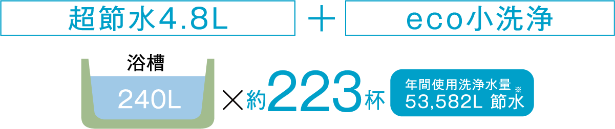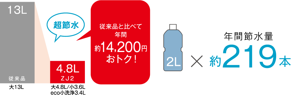大洗浄4.8L、小洗浄3.6Lの「超節水トイレ」。使用頻度の高い小洗浄の水量を減らすことで従来品(大13L)と比べ約71%の節水を実現。水道料金なら、年間約14,200円もお得です。