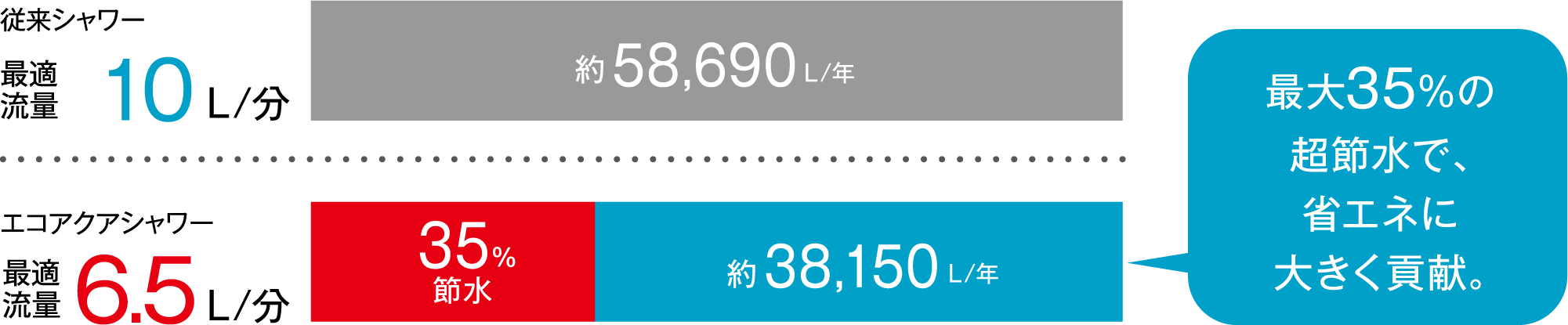 【試算条件】(国研)建築研究所「平成28年省エネルギー基準に準拠したエネルギー消費性能の評価に関す る技術情報(住宅)」における、「東京・4人世帯」の条件にて算出。【比較品】サーモ水栓+シャワーヘッド[最適流量10L/分]【引用元】(国研)建築研究所「平成28年省エネルギー基準に準拠したエネルギー性能の評価に関する技術情報(住宅)」および自社基準