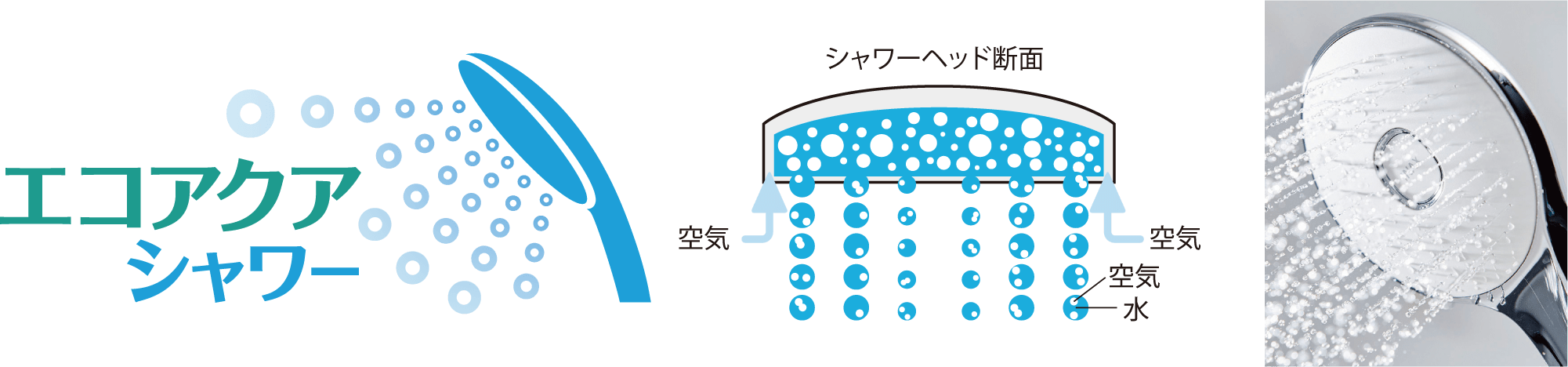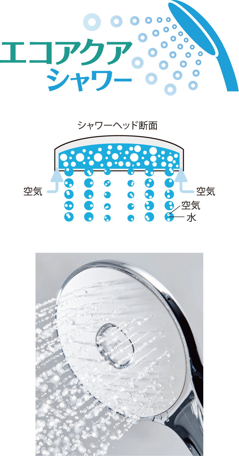 空気を含んだ大粒の水滴が心地よい超節水シャワー!