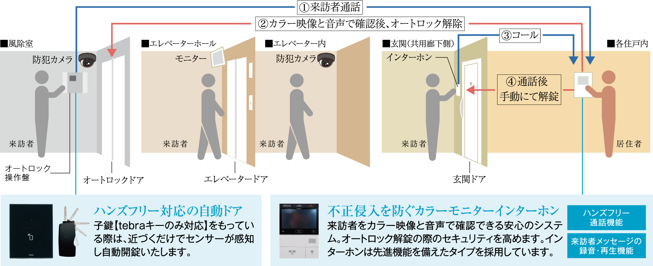 エントランスホールやエレベーターなどには、モニタリング機能付きの防犯カメラを設置。